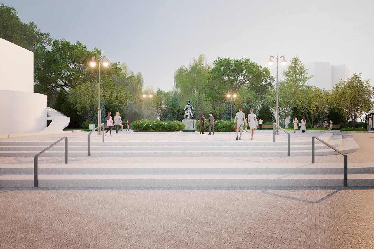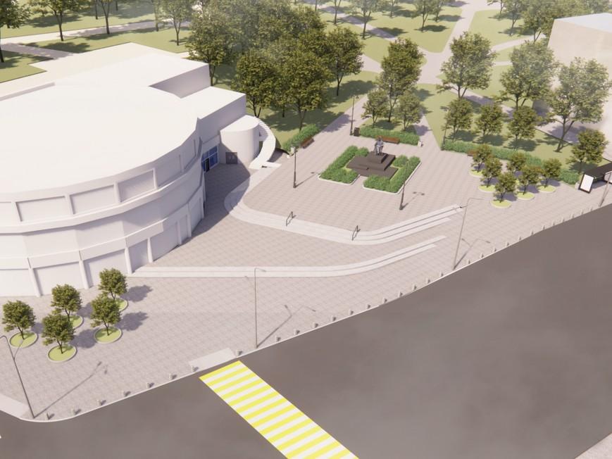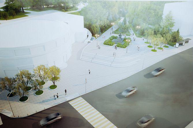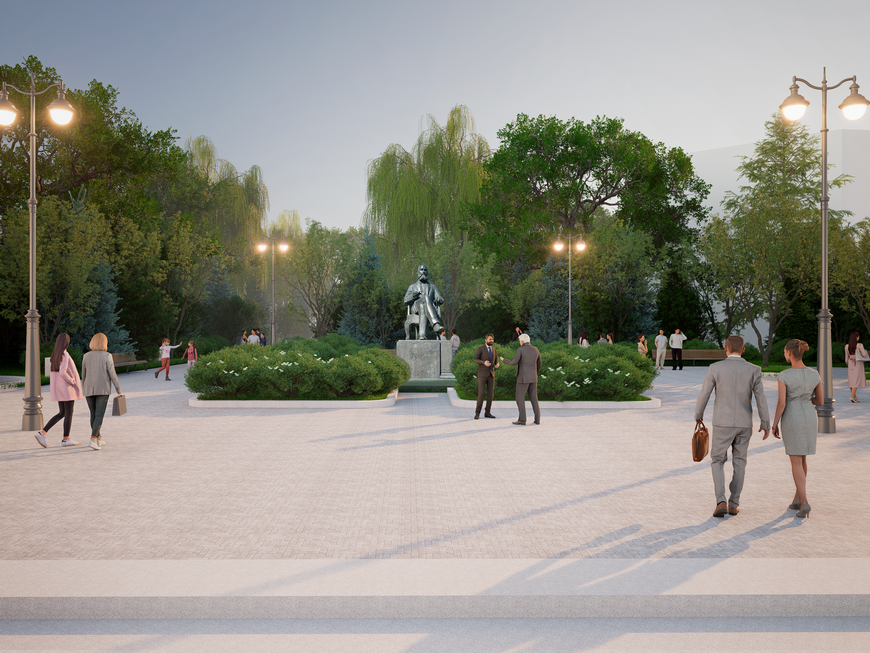 Территорию дополнят газонами с системой автополива, разместят малые архитектурные формы и камеры видеонаблюдения. Островок безопасности между улицами Пушкина и Нужина интегрируют с основной площадью, превратив его в озеленённую зону с высадкой деревьев для формирования полноценного общественного пространства.