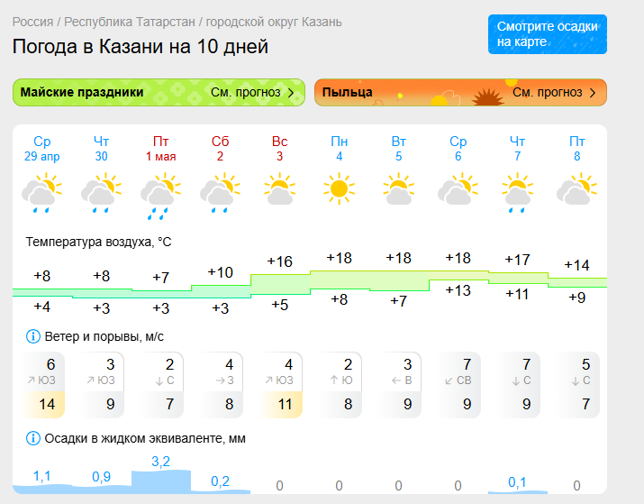Согласно данным сервиса Gismeteo, по-настоящему весенняя погода установится в столице Татарстана лишь на следующей неделе. Осадки должны прекратиться уже в субботу, 2 мая.